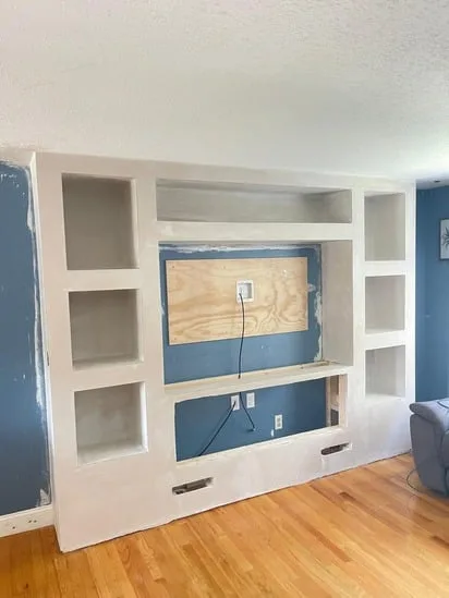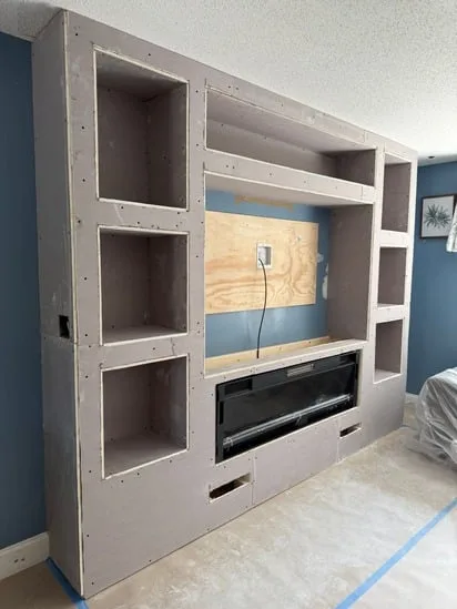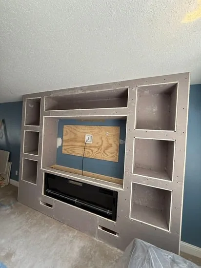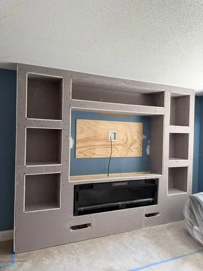 This project involved the construction of a built-in entertainment wall, designed to provide both functionality and a modern aesthetic. As the work progressed, transitional steps included framing, drywall installation, and precise cutouts for shelving and the fireplace unit. Furthermore, electrical integration and cable management were addressed to ensure a clean, seamless appearance. Ultimately, the entertainment wall transformed the living space into a practical yet stylish focal point, combining storage, display areas, and media integration in one cohesive structure.